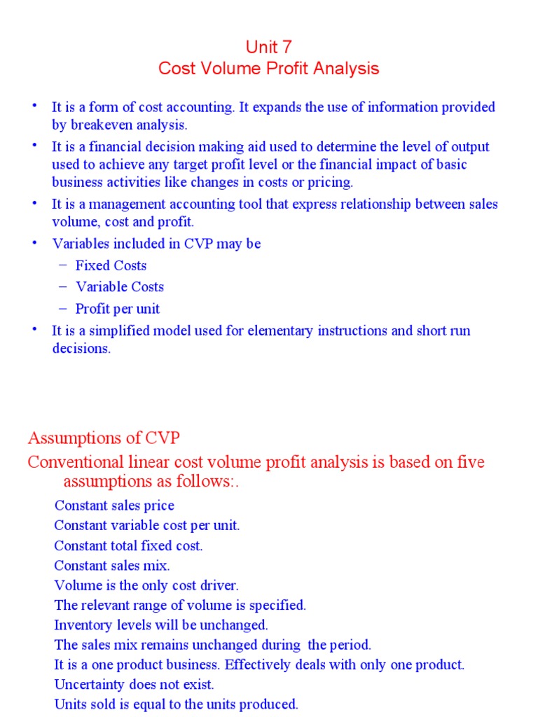 – Break even point = Fixed Cost / Unit Contribution Margin