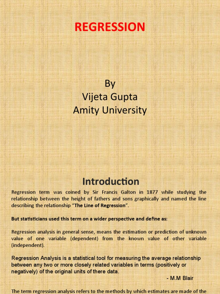 Regression term was coined by Sir Francis Galton in 1877 while studying the