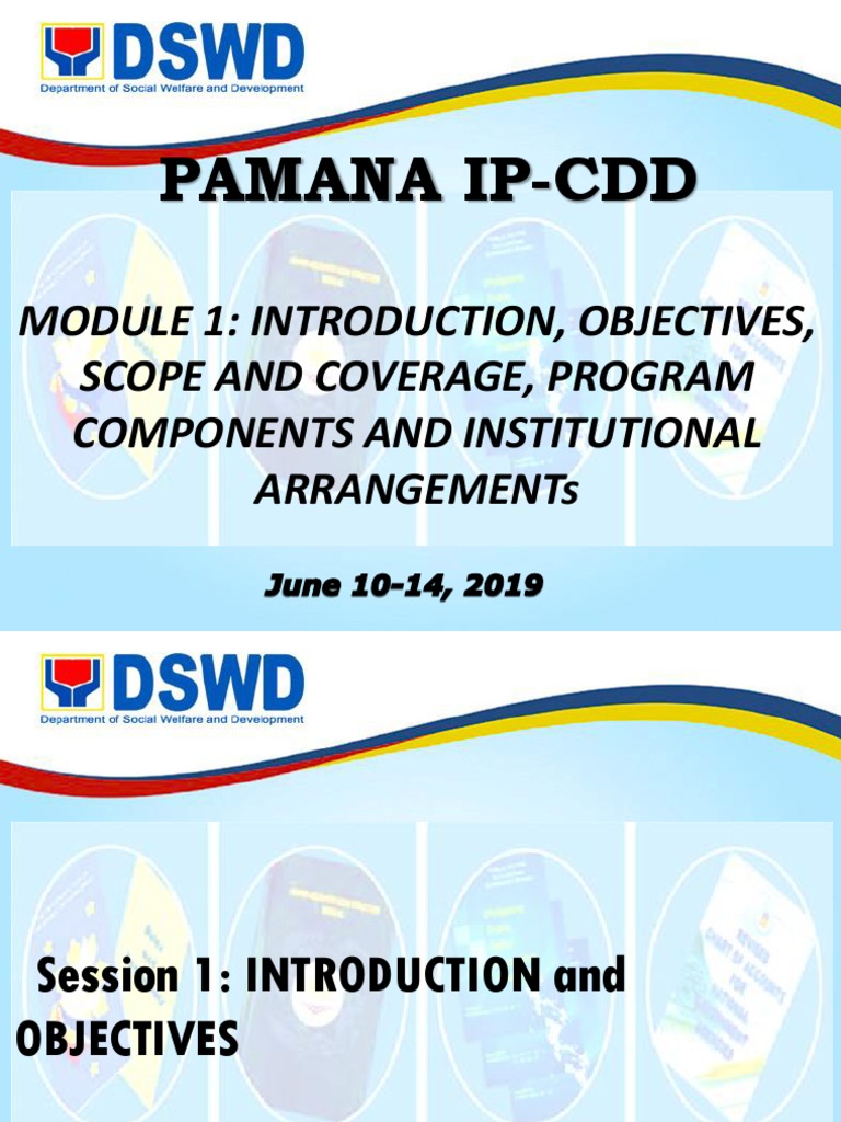 This document provides an introduction to the PAMANA IP-CDD program which aims to strengthen development in conflict-affected areas. It outlines the program's objectives and scope, components, and institutional arrangements across 3 sessions covering introductions, objectives, scope and coverage, and program components and institutional arrangements.