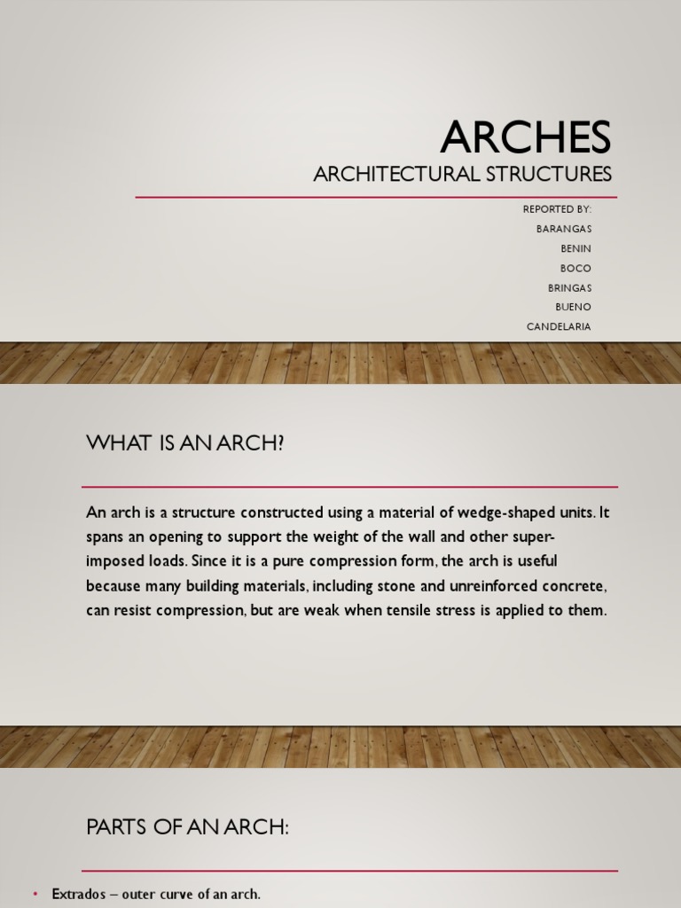 An arch is a structure constructed using a material of wedge-shaped units. It