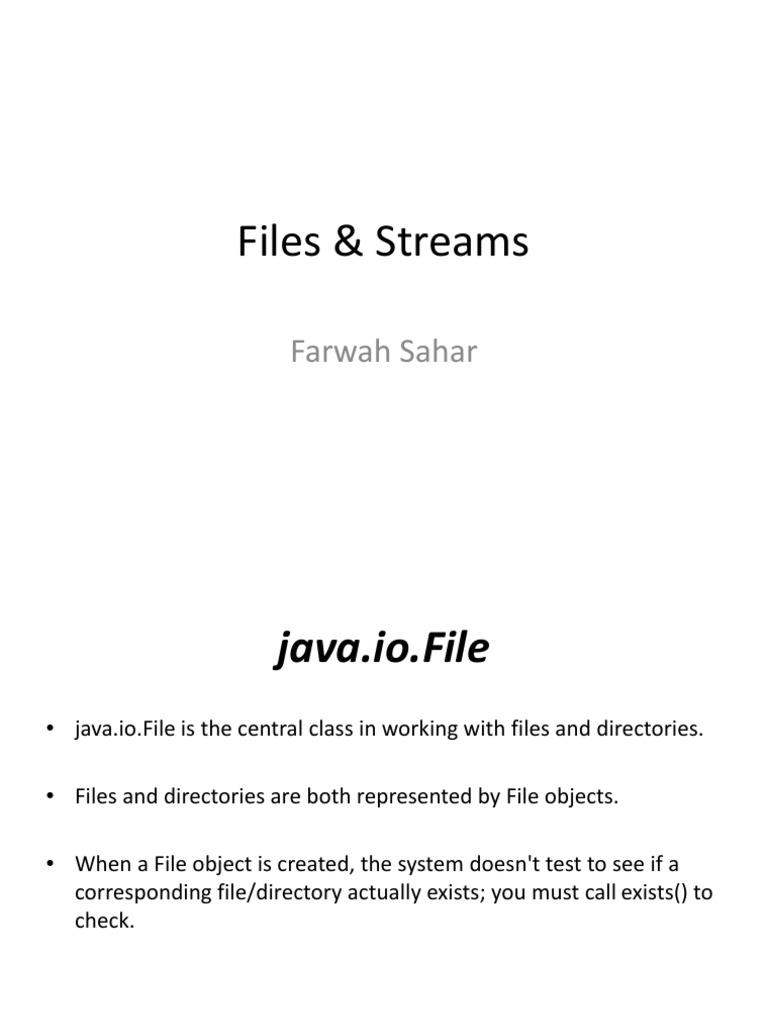 • java.io.File is the central class in working with files and directories.