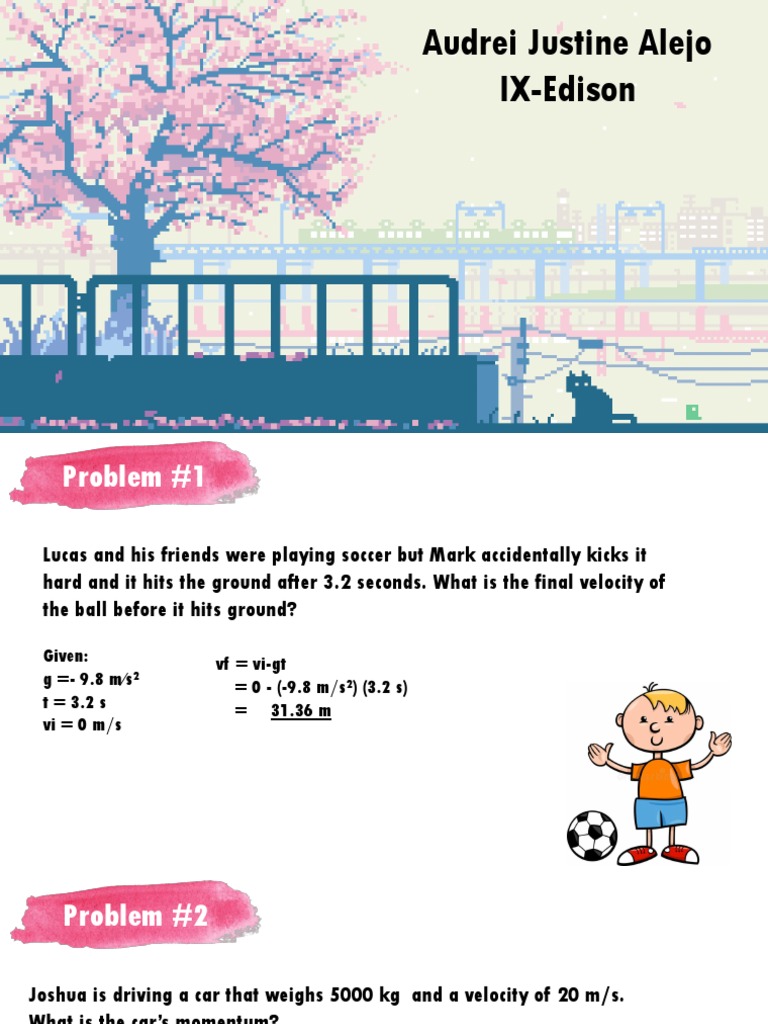Joshua is driving a car that weighs 5000 kg and a velocity of 20 m/s.