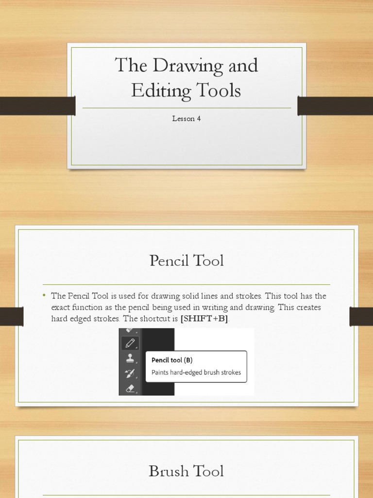 • The Pencil Tool is used for drawing solid lines and strokes. This tool has the