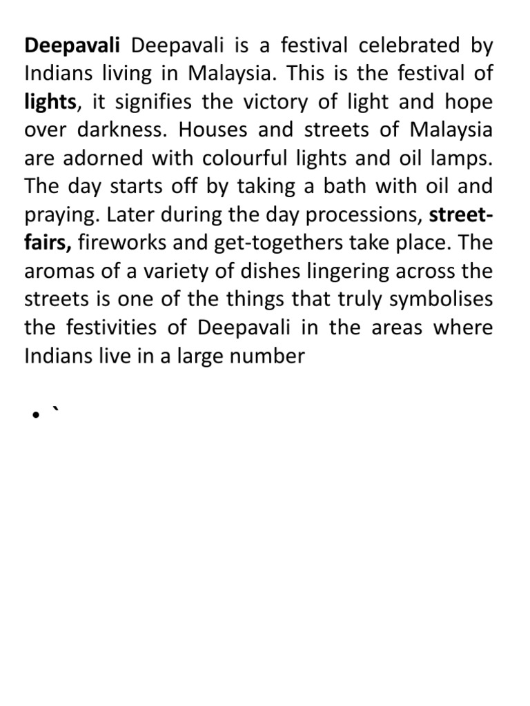 Deepavali Deepavali is a festival celebrated by