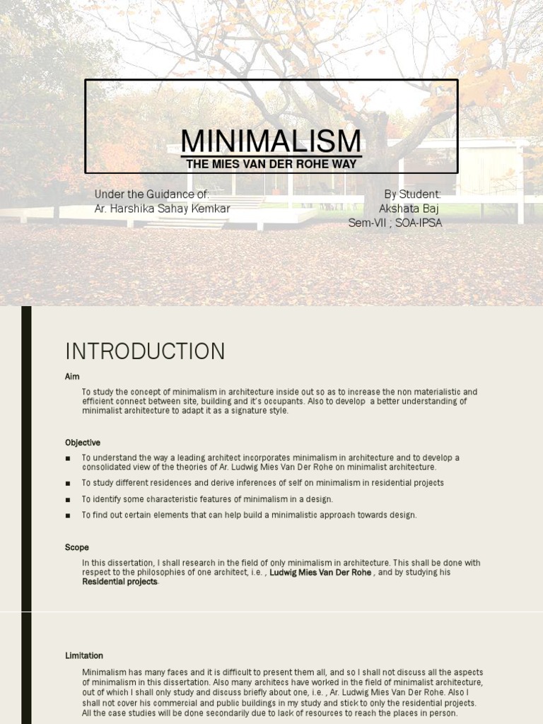 consolidated view of the theories of Ar. Ludwig Mies Van Der Rohe on minimalist architecture.