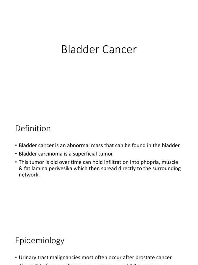 • Bladder cancer is an abnormal mass that can be found in the bladder.