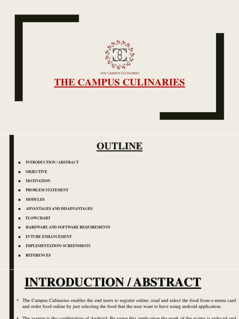 • The Campus Culinaries enables the end users to register online, read and select the food from e-menu card