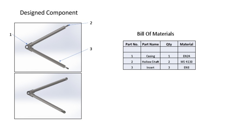 The document is a bill of materials listing the parts, part numbers, names, quantities, and materials for a designed component. It includes 3 parts: a casing, 2 hollow shafts, and 3 inserts made of various materials including EN24, MS 4130, and EN8.