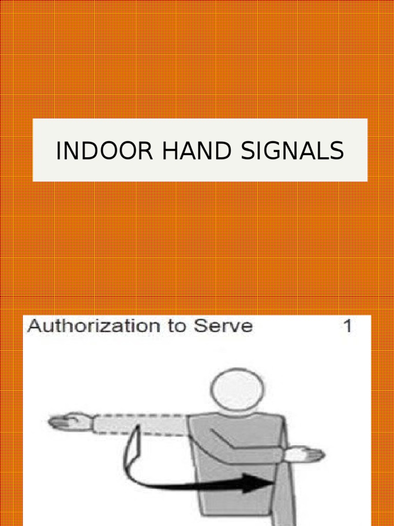 The document provides hand signals for indoor communication. It suggests using hand signals to quietly communicate thanks for listening and that the message was cute while avoiding audible noise that could disturb others indoors. The signals keep communication discreet when voice volume needs to remain low.
