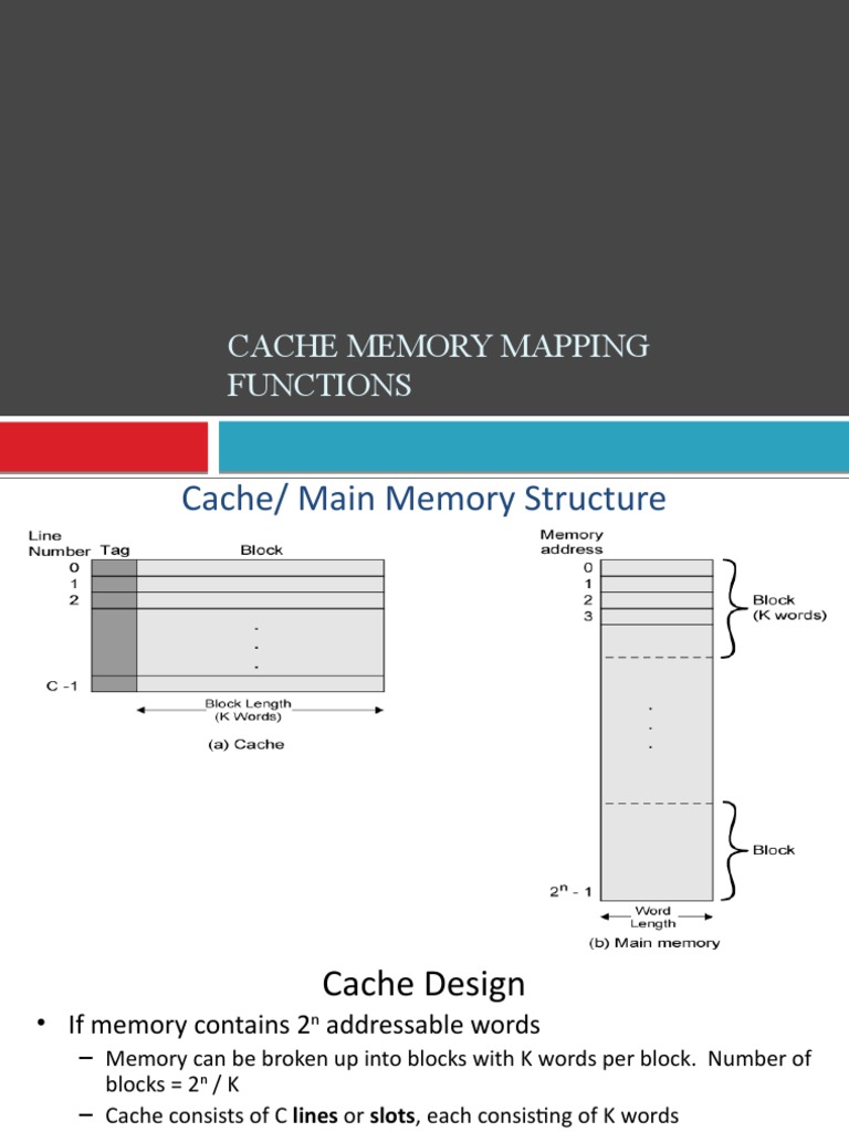 • Cache block no = memory block no % number of cache lines or blocks (b = j mod c)