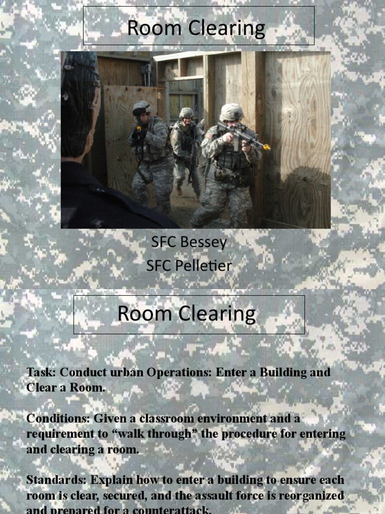 - Move tactically and silently while securing the corridors to the room to be cleared.