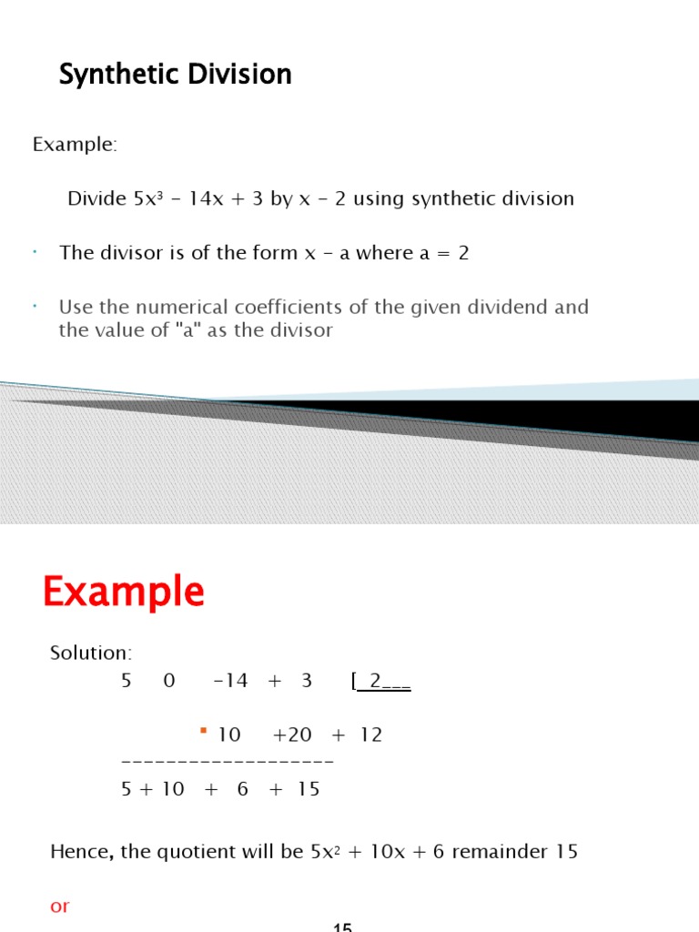 Hence, the quotient will be 5x2 + 10x + 6 remainder 15