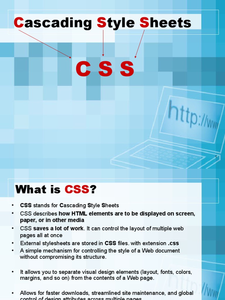 • CSS stands for Cascading Style Sheets