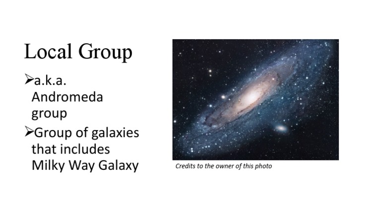 The Local Group is a group of galaxies that includes the Milky Way Galaxy and Andromeda Galaxy. It is also sometimes referred to as the Andromeda Group. The Local Group consists of about 54 galaxies bound together by gravity in a region about 10 million light-years in diameter.