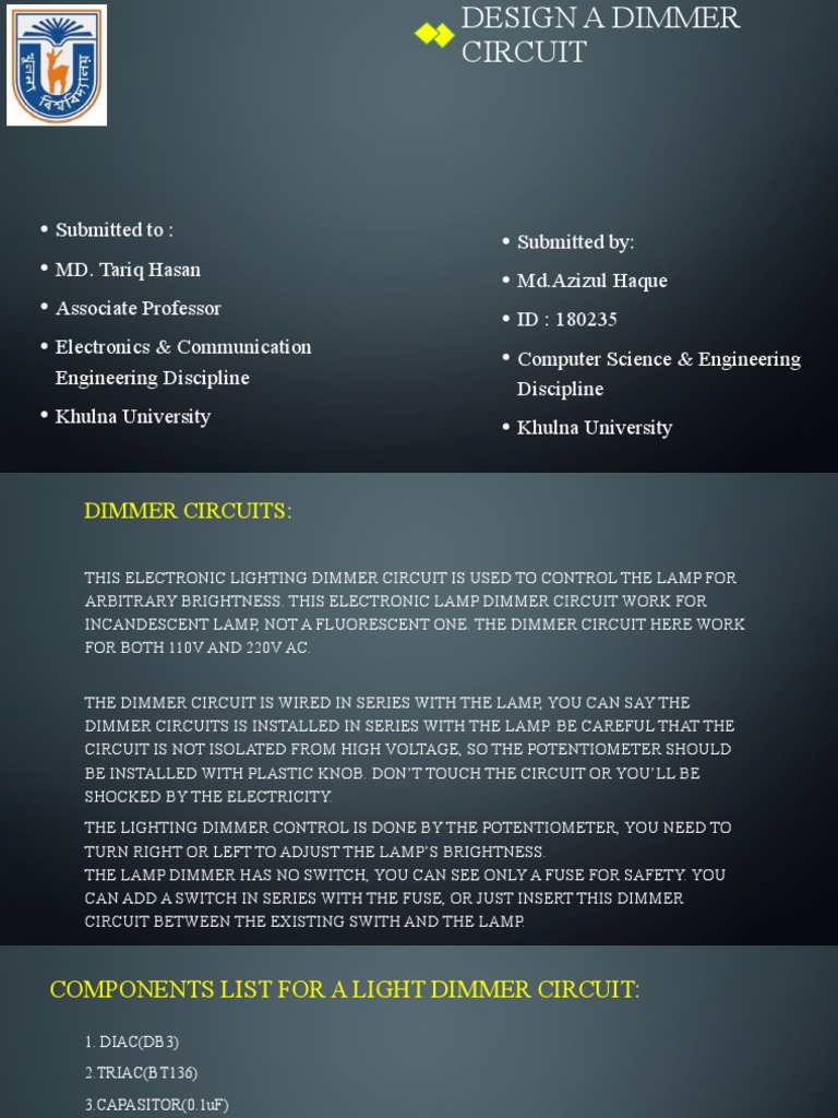 THIS ELECTRONIC LIGHTING DIMMER CIRCUIT IS USED TO CONTROL THE LAMP FOR