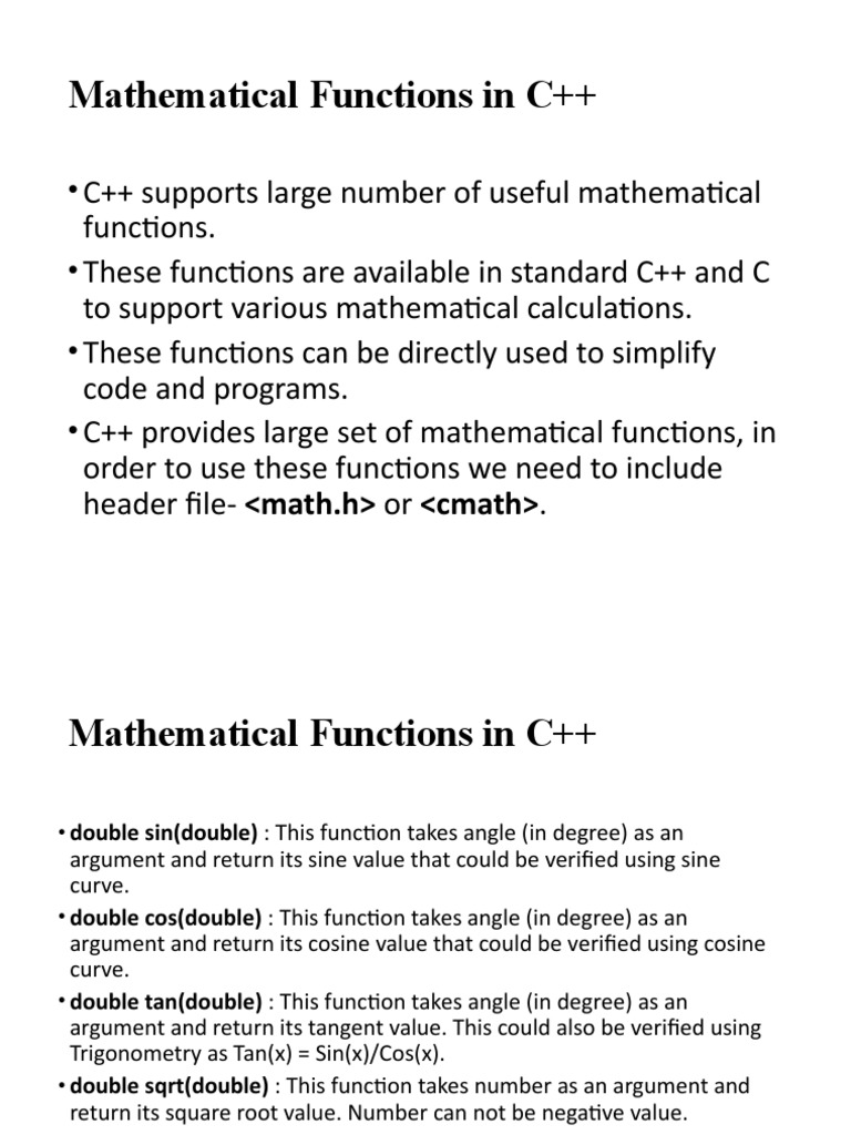 • cout << "Arc Cosine value of x=1.0 : " << • cout << "Log value of y=100.0 is : " << log(y)