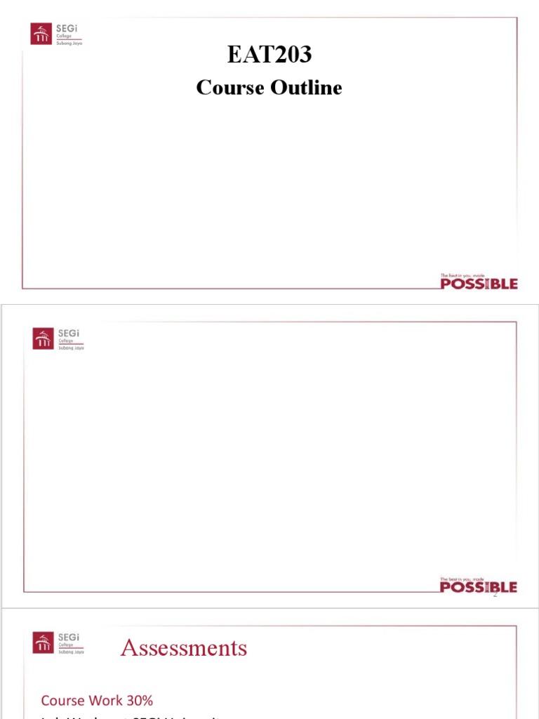 This course outline provides information on assessments for EAT203, which includes course work making up 30% of the grade consisting of lab work completed at SEGi University and individual assignments, and a final exam making up 70% of the grade which will be 60 minutes and cover all learning outcomes from the course.