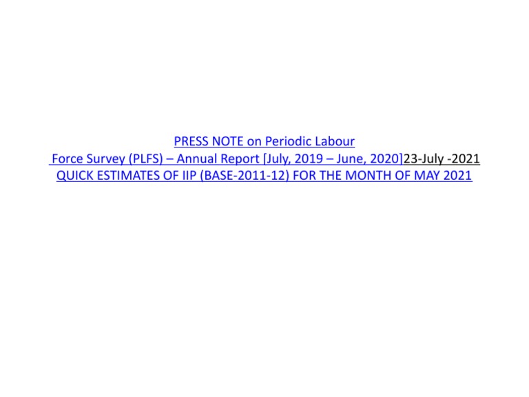 The document provides a press note regarding the Periodic Labour Force Survey (PLFS) Annual Report covering the period from July 2019 to June 2020. It also includes quick estimates of the Index of Industrial Production (IIP) for May 2021, based on the 2011-12 base year. The report was released on July 23, 2021.