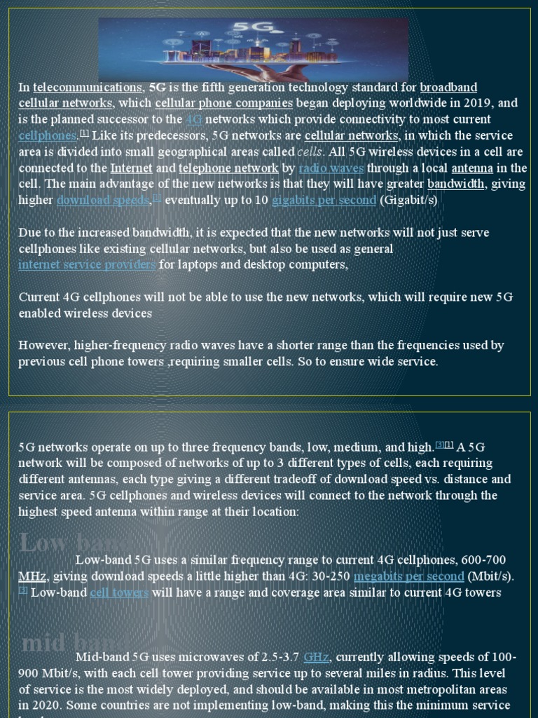 5G networks operate on up to three frequency bands, low, medium, and high.[3][1] A 5G