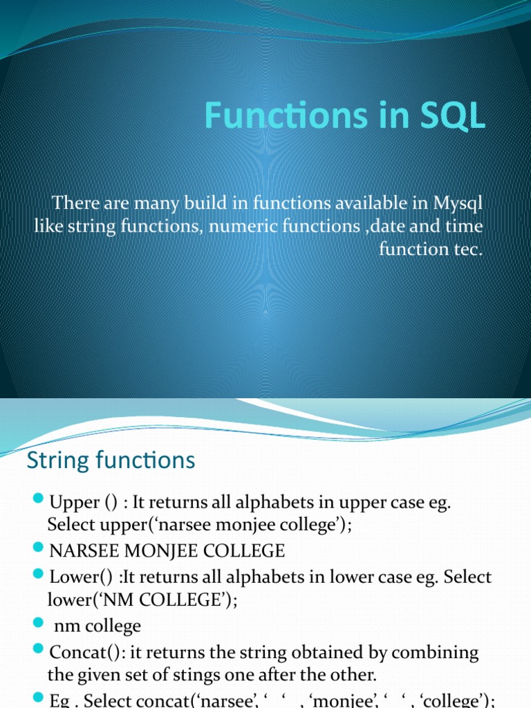 Eg . Select concat(‘narsee’, ‘ ‘ , ‘monjee’, ‘ ‘ , ‘college’);