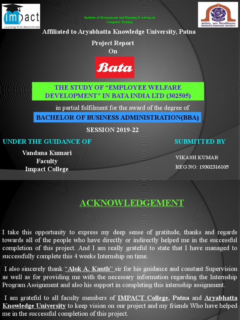 INTERNSHIP at BATA INDIA LTD., in BATAGANJ FACTORY, RAMJICHAK,