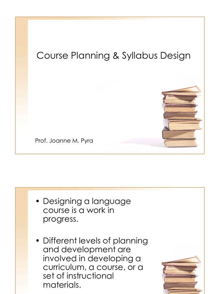 Designing a language course is a work in progress. Different levels of planning and development are involved in developing a curriculum, a course, or a set of instructional materials.