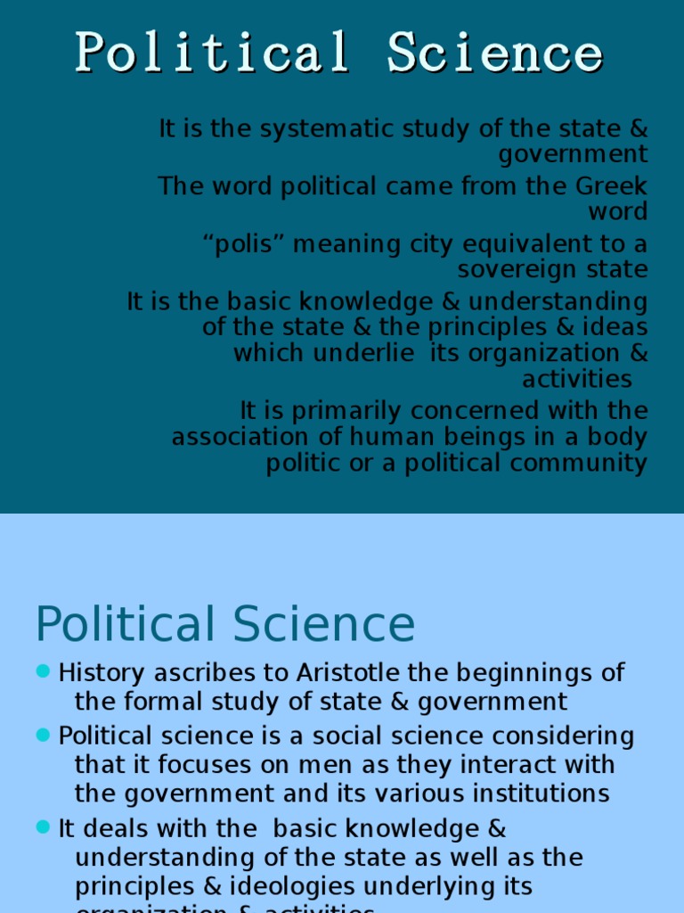 It is the systematic study of the state & government The word political came from the Greek word polis meaning city equivalent to a sovereign state It is the basic knowledge & understanding of the state & the principles & ideas which underlie its organization & activities It is primarily concerned with the association of human beings in a body politic or a political community
