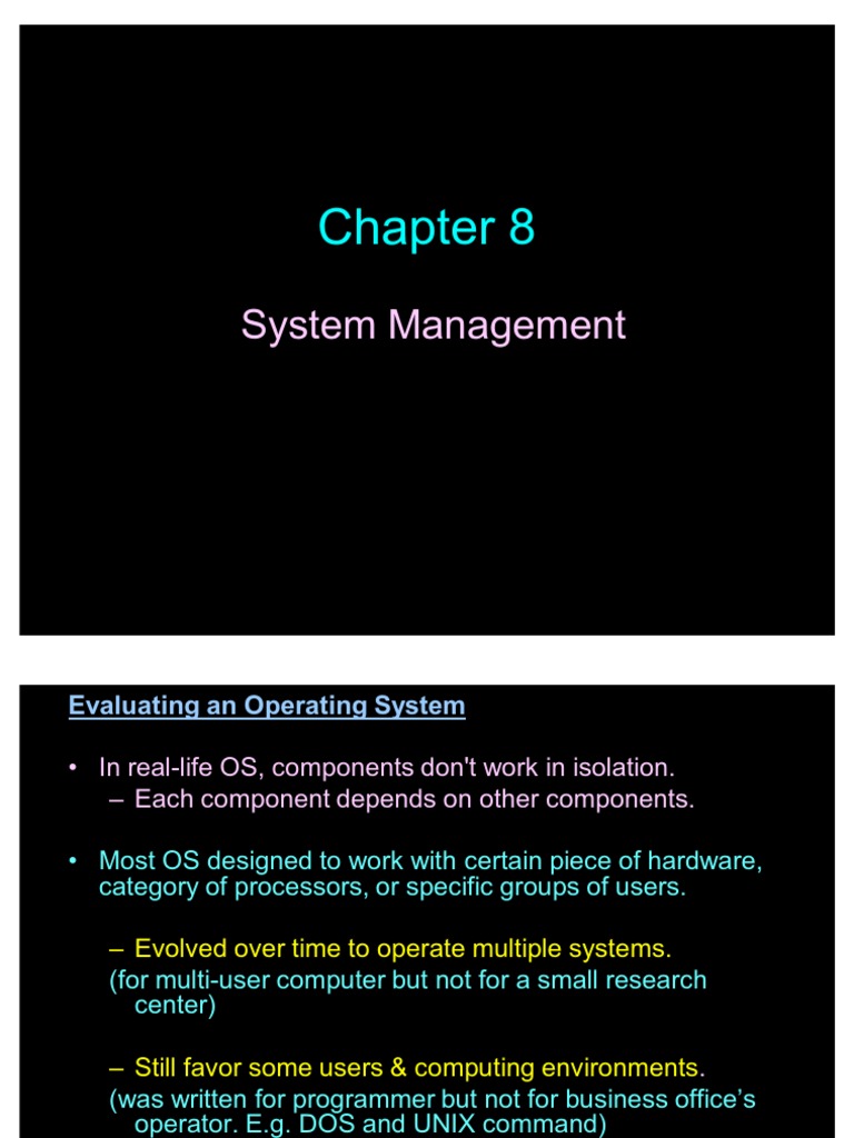 Evaluating an Operating System In real-life OS, components don't work in isolation. Each component depends on other components. Most OS designed to work with certain piece of hardware, category of processors, or specific groups of users. Evolved over time to operate multiple systems. (for multi-user computer but not for a small research center) Still favor some users & computing environments. (was written for programmer but not for business offices operator. E.g. DOS and UNIX command) To evaluate OS, must understand design goals, history, how it communicates with users, how resources managed, & what trade-offs made to achieve goals.