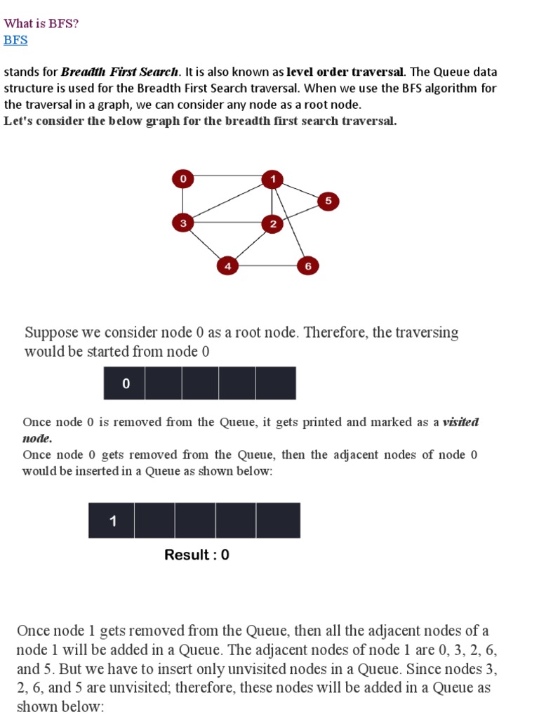 node 1 will be added in a Queue. The adjacent nodes of node 1 are 0, 3, 2, 6,