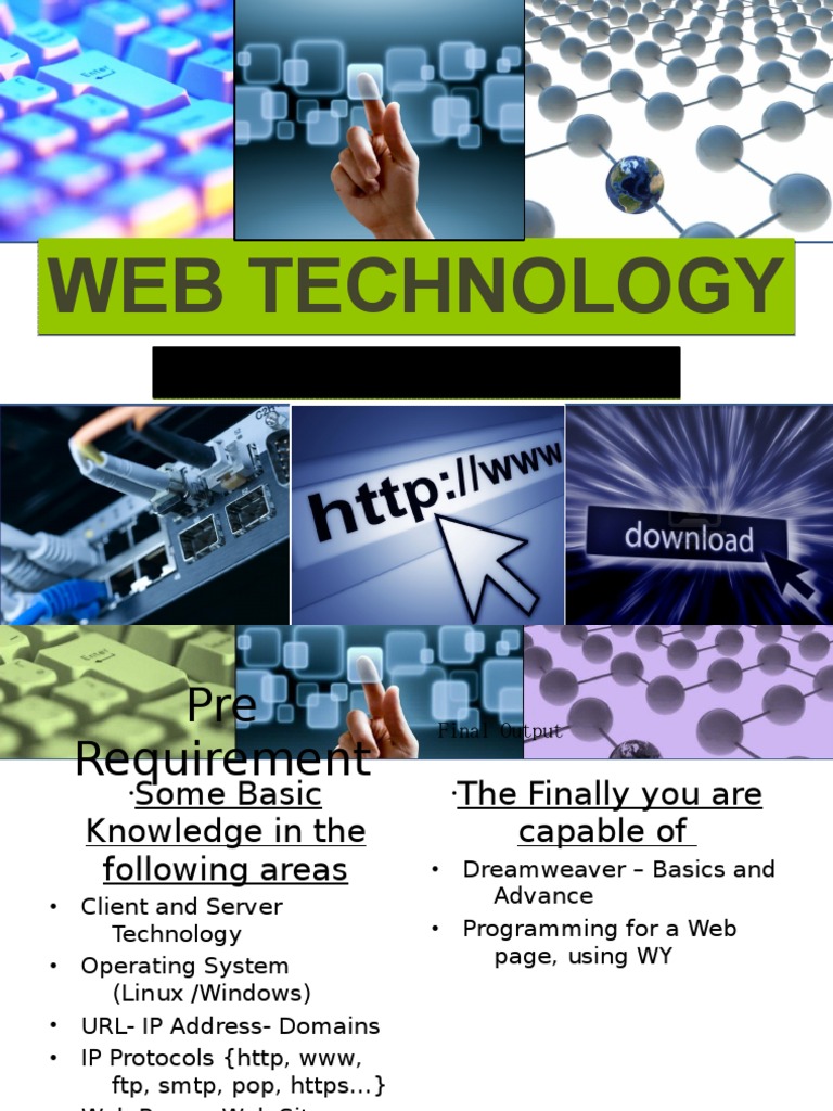 Client and Server Technology Operating System (Linux /Windows) URL- IP Address- Domains IP Protocols {http, www, ftp, smtp, pop, https} Web Page Web Site Browser Photoshop or any photo editing tool