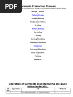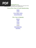 This process map outlines the key steps to manufacture a garment from fiber to finished product. The process involves taking fiber through spinning to create thread, then knitting or weaving the thread into grey fabric. The grey fabric undergoes various finishing processes like dyeing, printing, and inspection before being cut and sewn into garments for final packing and distribution.
