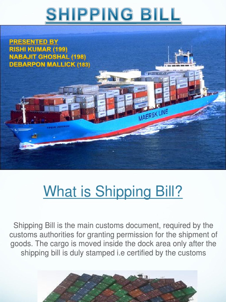 Shipping Bill is the main customs document, required by the customs authorities for granting permission for the shipment of goods. The cargo is moved inside the dock area only after the shipping bill is duly stamped i.e certified by the customs
