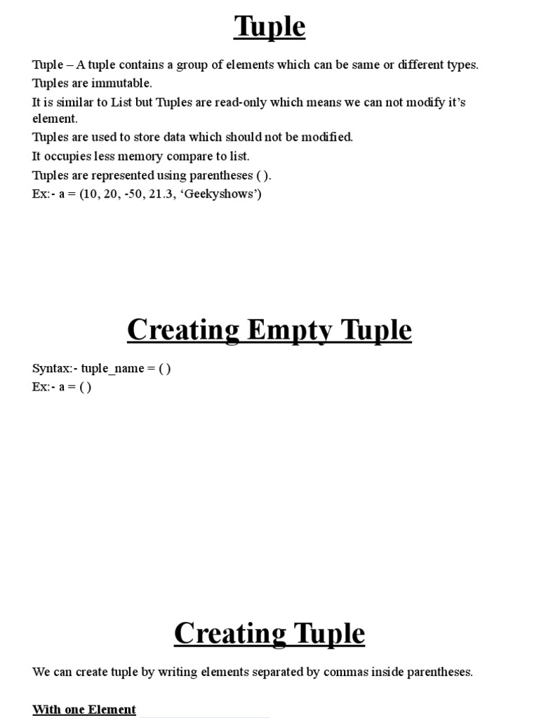 Tuple – A tuple contains a group of elements which can be same or different types.