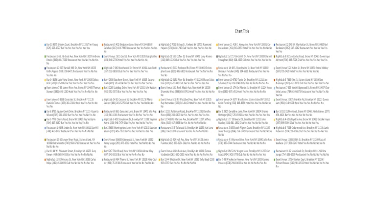 Bar 14 8156 Lake View Street, New York, NY 10025 Debra Bar 4 2930 Southern Street, New York NY 10005 Susana Nightclub 12 9151 River St, Brooklyn NY 11230 Shaun Salva- Event Venue 10 9760 Taylor Dr, Brooklyn NY 11211 Joe Nightclub 5 7839 Elm St, Staten Island NY 10306 Lee
