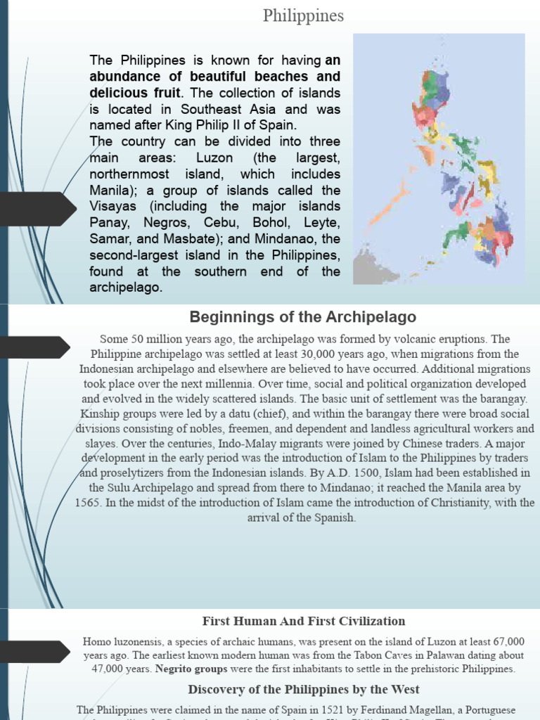Philippine archipelago was settled at least 30,000 years ago, when migrations from the