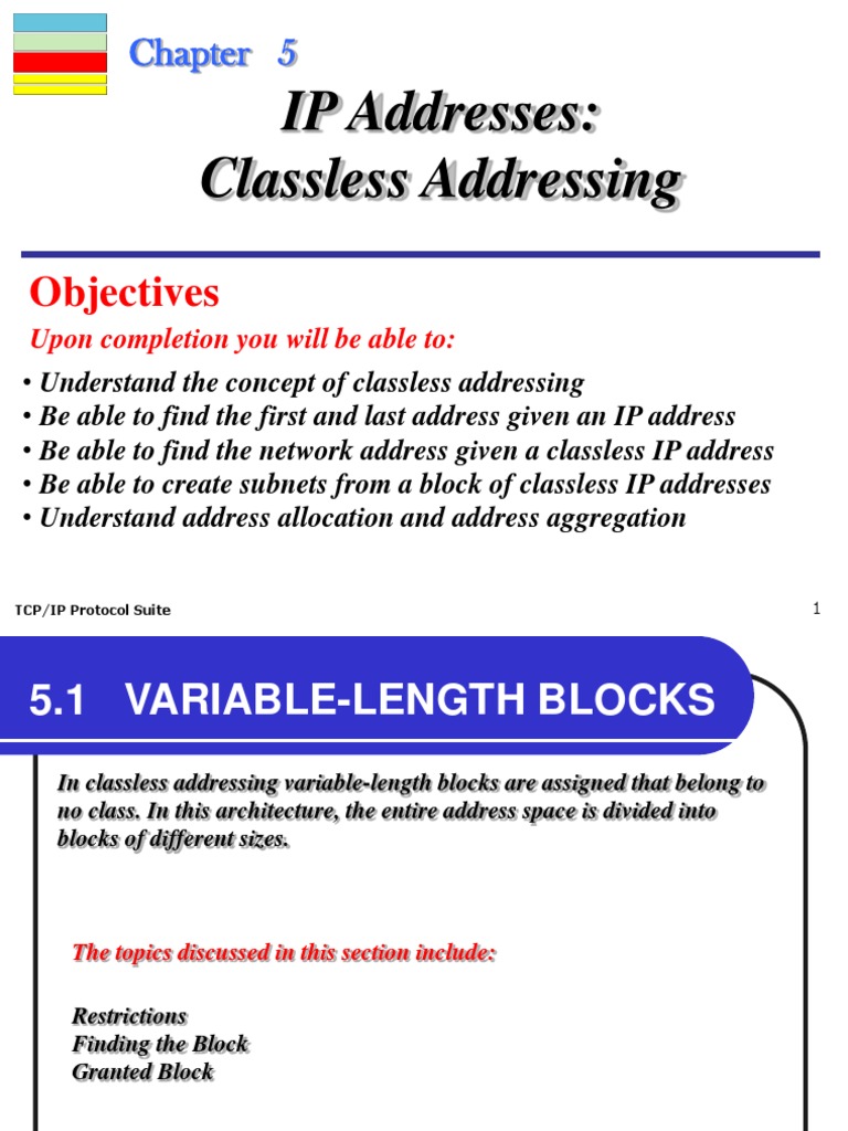 Upon completion you will be able to: Understand the concept of classless addressing Be able to find the first and last address given an IP address Be able to find the network address given a classless IP address Be able to create subnets from a block of classless IP addresses Understand address allocation and address aggregation