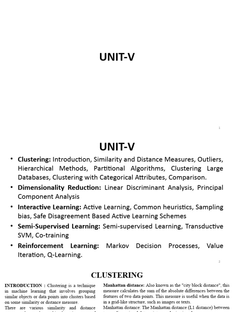 • Clustering: Introduction, Similarity and Distance Measures, Outliers,