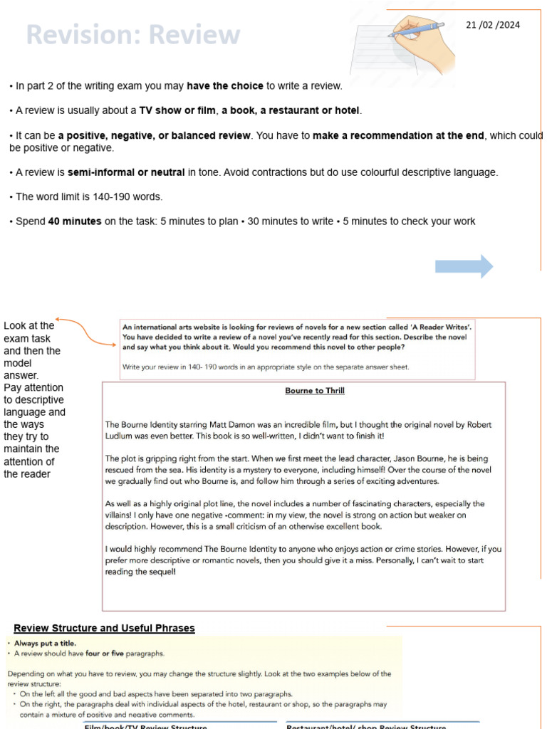 • A review is semi-informal or neutral in tone. Avoid contractions but do use colourful descriptive language.