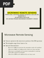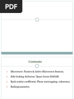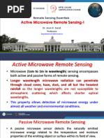 Active system (works day or night). There is also passive microwave imaging (radiometer) mode. This senses surface radio-emission, which can be converted to radiant temperatures. Not affected by cloud cover or haze if l > 2 cm. It operates independent of weather conditions. Water clouds have a significant effect on radar with wavelength l < 2 cm. Unaffected by rain l > 4 cm. Can penetrate well-sorted dry sand in hyper-arid regions to a depth of about 2 m.