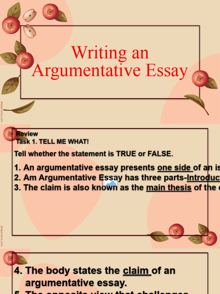 FALSE 2. An Argumentative Essay has three parts-Introdu