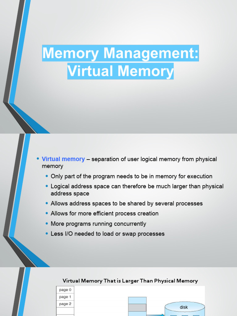 • Virtual memory – separation of user logical memory from physical