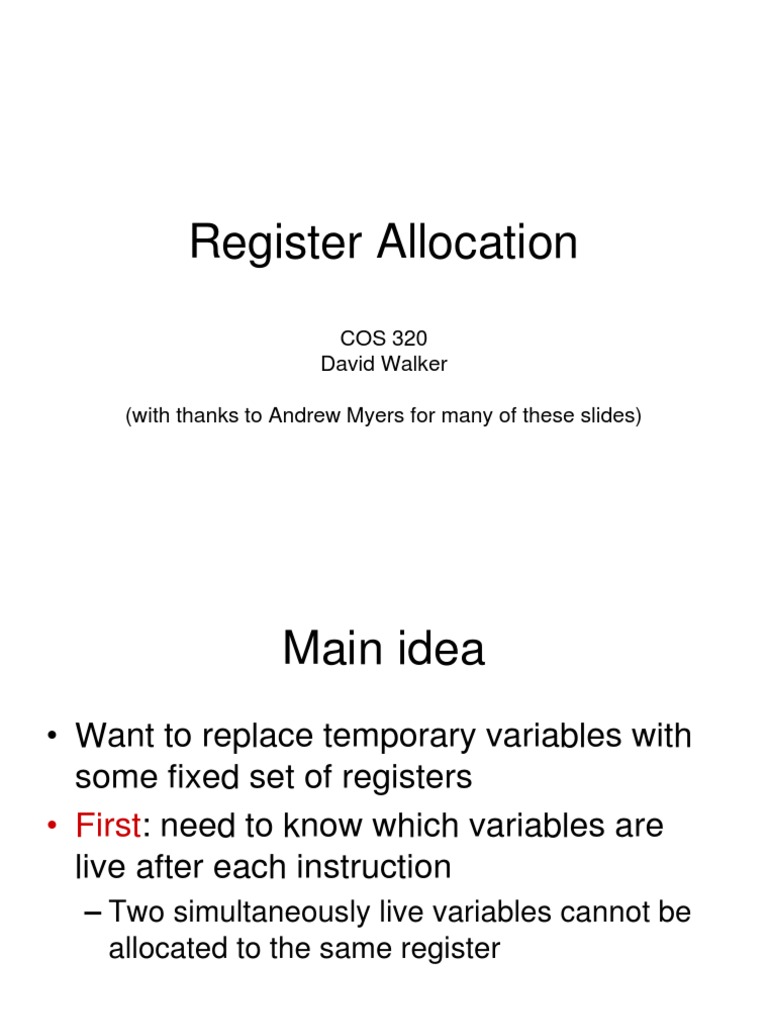 Want to replace temporary variables with some fixed set of registers First: need to know which variables are live after each instruction