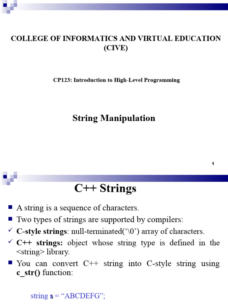 char firstLetter=courseID[0] //accesses character ‘I’ 6