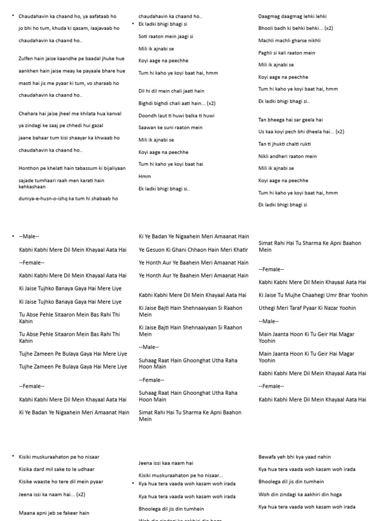 • Jaise phool tode honge tumne jholi bharke • Kitni muddate hui hai, tumne khat kyun nahi Meri manzilon ka ek hi raasta ho tum