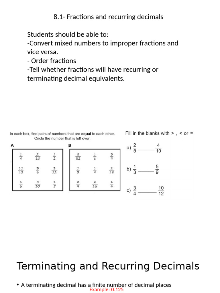 • A recurring decimal contains a digit or group of digits that repeat forever