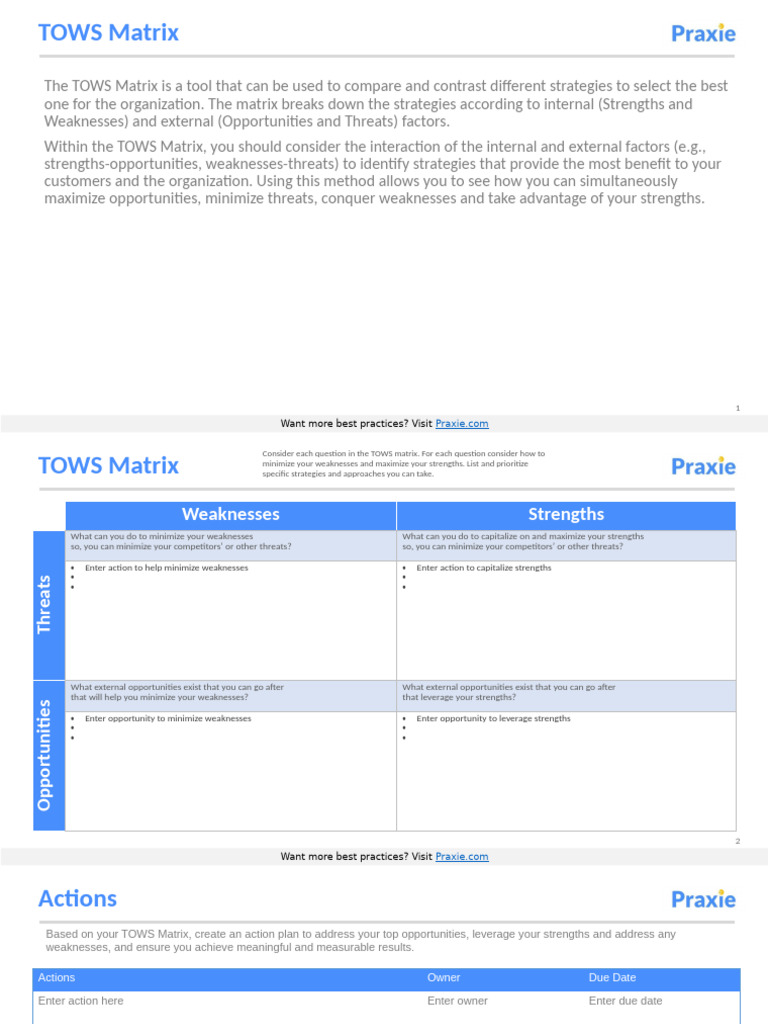 TOWS Matrix minimize your weaknesses and maximize your strengths. List and prioritize