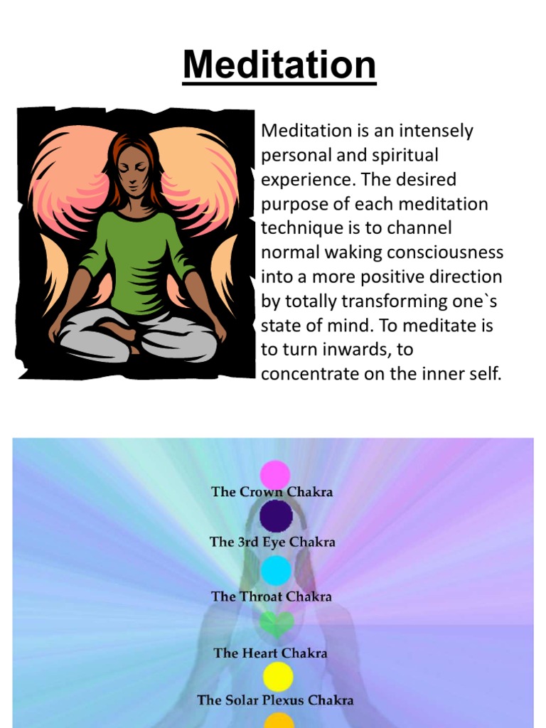 Meditation is an intensely personal and spiritual experience. The desired purpose of each meditation technique is to channel normal waking consciousness into a more positive direction by totally transforming one`s state of mind. To meditate is to turn inwards, to concentrate on the inner self.