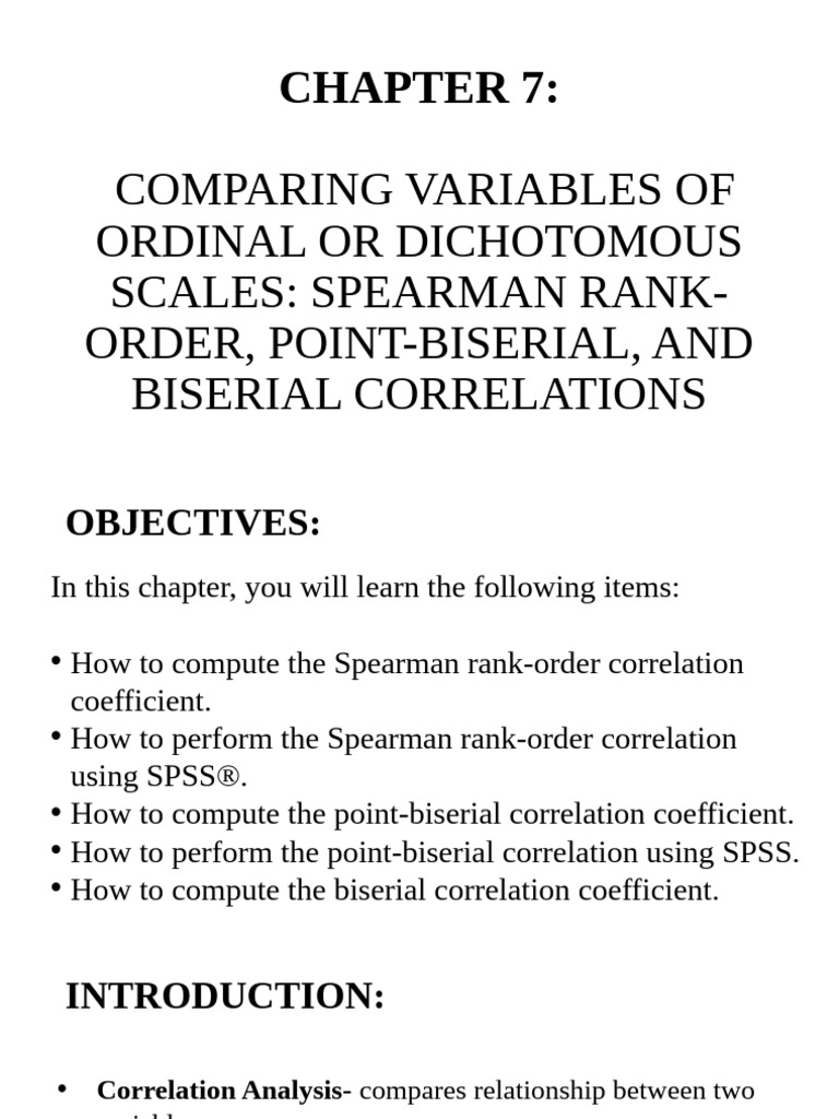 • Spearman rank-order correlation (Spearman’s ρ)- used to