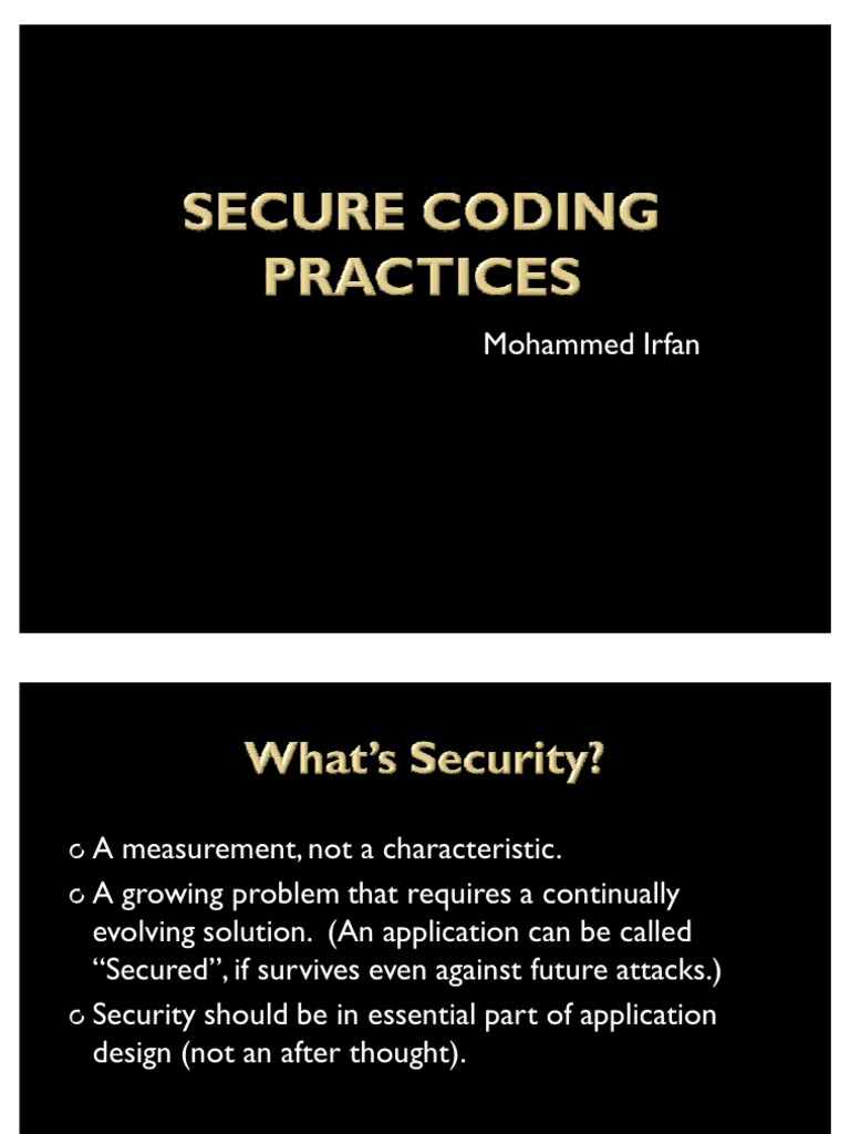 measurement, not a characteristic. A growing problem that requires a continually evolving solution. (An application can be called Secured, if survives even against future attacks.) Security should be in essential part of application design (not an after thought).