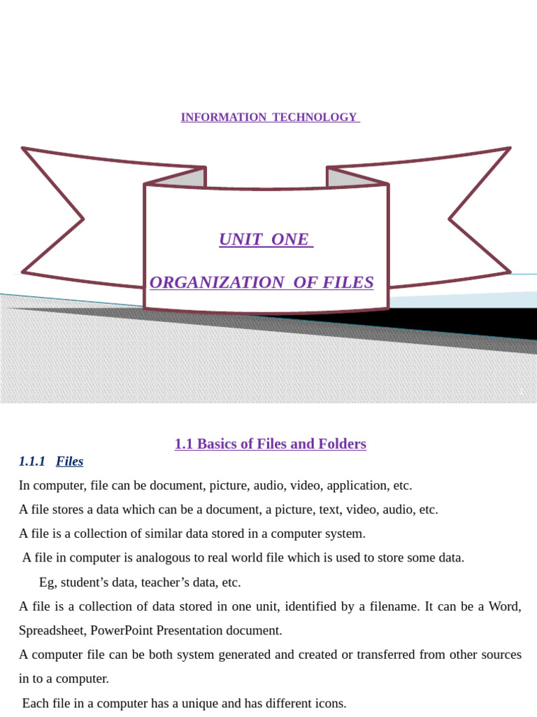 A file is a collection of data stored in one unit, identified by a filename. It can be a Word,